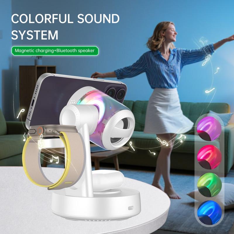QI2.2 Stazione di ricarica wireless magnetica da 25W con altoparlante Bluetooth e illuminazione ambientale RGB - Caricatore 3-in-1 per telefono, auricolari e smartwatch