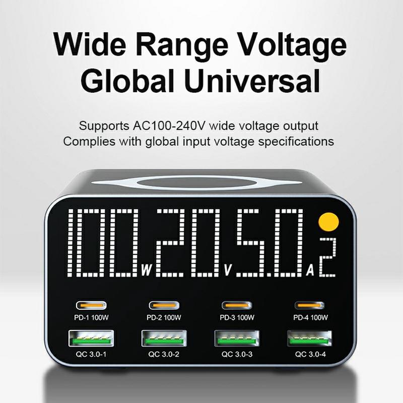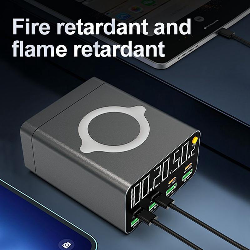 Un pad di ricarica wireless integrato da 5-15W aggiunge ulteriore comodità agli smartphone e agli auricolari abilitati Qi. Il chipset GaN garantisce un migliore controllo termico, una maggiore efficienza e dimensioni ridotte, mentre la compatibilità con la tensione globale (100-240 V CA) lo rende ideale per i viaggi e l'uso internazionale.