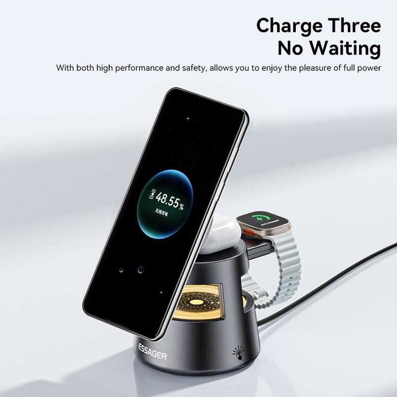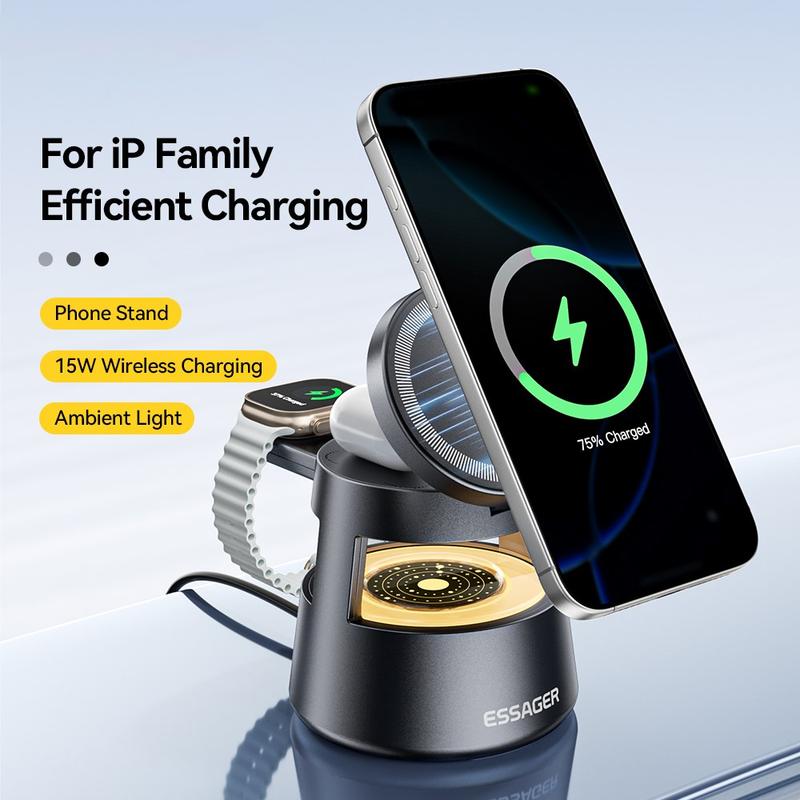 Questo caricabatterie ESSAGER 4-in-1 combina ricarica rapida, stabilità magnetica, illuminazione morbida e supporto per più dispositivi in un unico design salvaspazio, perfetto per la casa, l'ufficio o il letto.