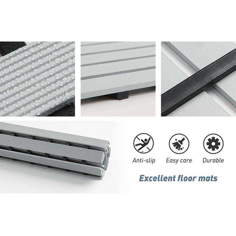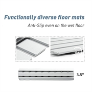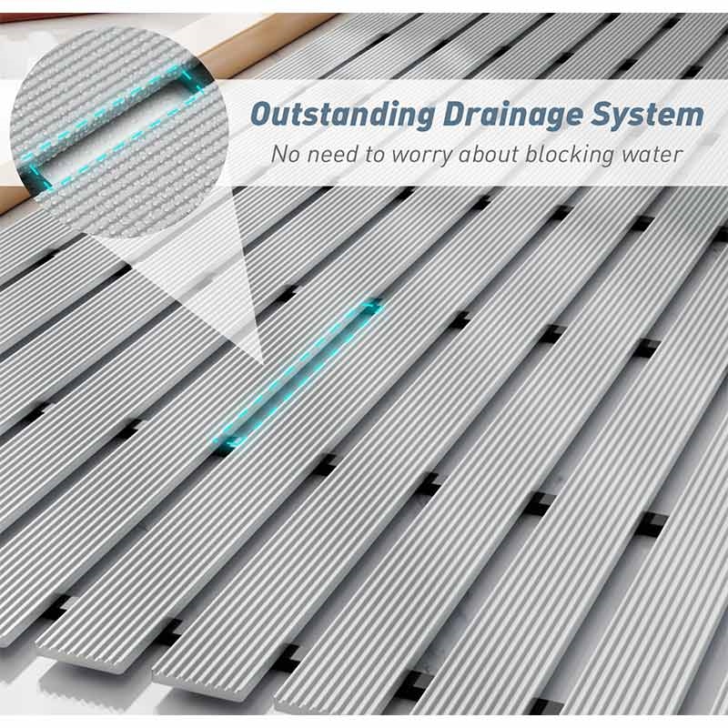 Dotato di ampie fessure di drenaggio posizionate strategicamente, il tappetino consente all'acqua di passare rapidamente, evitando ristagni e aiutando il pavimento ad asciugarsi più rapidamente. In questo modo si riduce anche il rischio di formazione di muffa e di aree intasate.