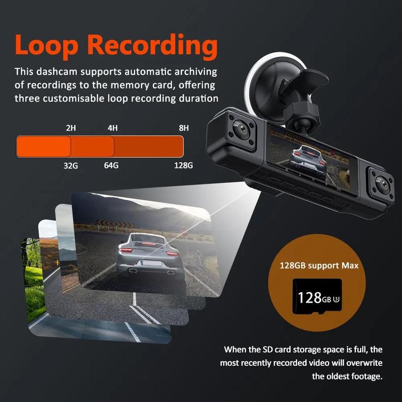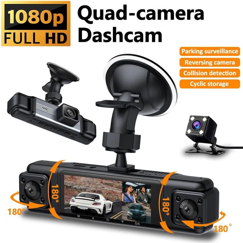 Rimanete al sicuro e completamente protetti sulla strada con questa dash cam a 4 lenti con schermo IPS da 3.0", progettata per registrare il vostro viaggio con eccezionale chiarezza. Dotata di una telecamera frontale da 1080P e di tre ulteriori obiettivi laterali e posteriori da 480P, offre una copertura completa a 360° per un'esperienza di guida più sicura e protetta.
