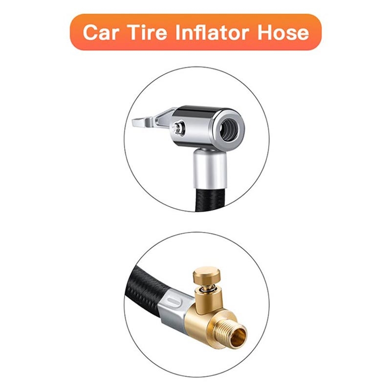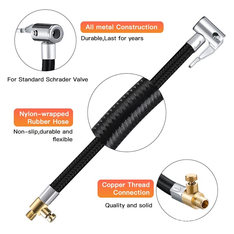 Questo resistente tubo antiusura per gonfiare gli pneumatici rende il gonfiaggio più veloce, facile e conveniente. Progettato per auto, biciclette e motociclette, si attacca rapidamente alle pompe d'aria e mantiene un collegamento sicuro grazie all'interfaccia filettata e al design ad alta pressione.
