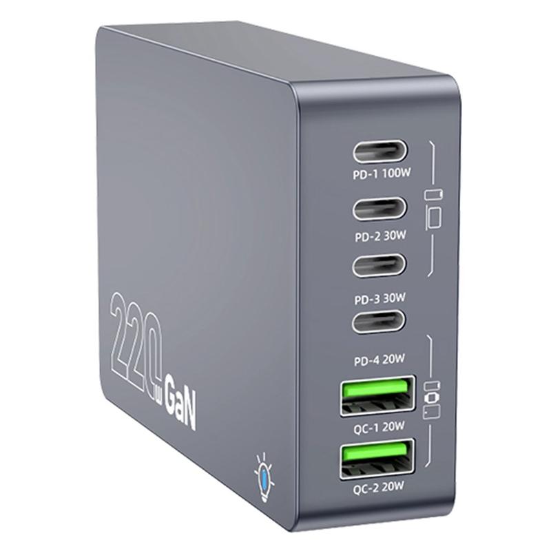 Stazione di ricarica da tavolo WLX-F8A 220W GaN - Adattatore di ricarica rapida a 6 porte - Spina UE, 4x USB-C, 2x USB-A