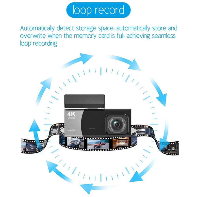 - Sistema a tre lenti con registrazione frontale 4K, interna 720P e posteriore 720P