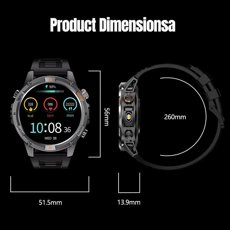 Progettato per le avventure all'aria aperta, l'orologio è dotato di una torcia incorporata, di un sistema di posizionamento GPS e di una bussola digitale, che aiutano a percorrere i sentieri e a tracciare i percorsi in tutta sicurezza. La batteria ad alta capacità da 580 mAh offre prestazioni di lunga durata, garantendo fino a 40 giorni di standby e circa 7 giorni di utilizzo regolare. Con un grado di impermeabilità IP68, resiste senza problemi a pioggia, schizzi e nuoto.